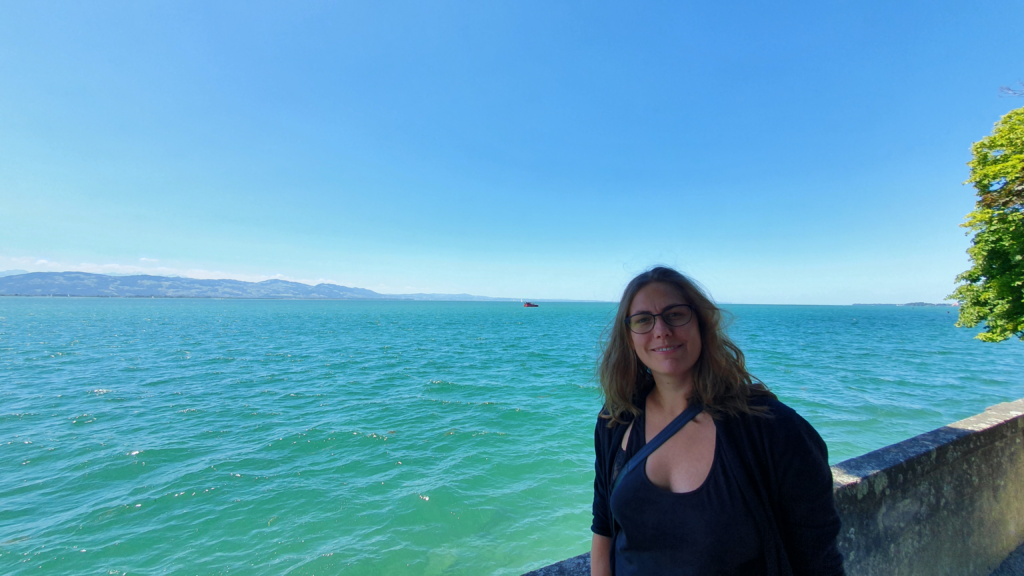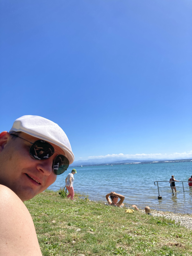 Vi fandt en fin græsplæne ned til søen lige ved nogle campingpladser og dyppede os i søen og slappede af i en times tid. Vandet var koldere end ved Füssen, men udsigten var flot.