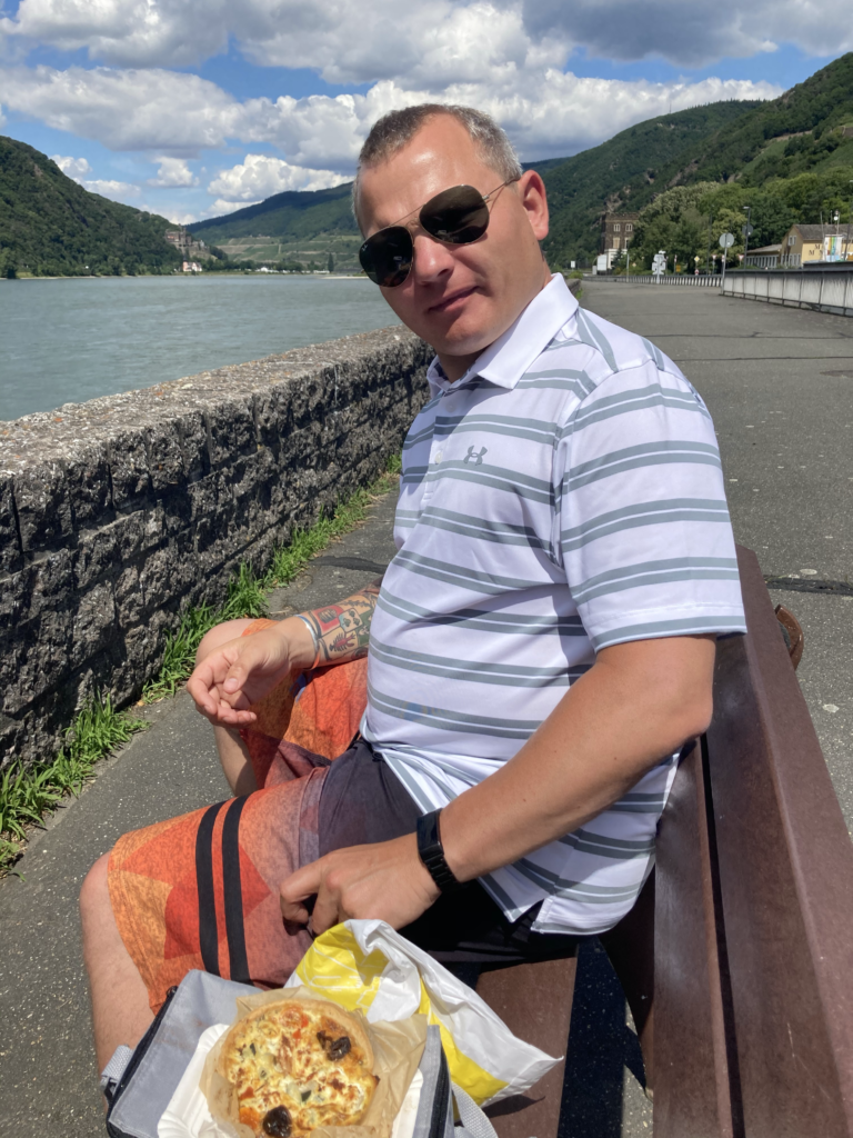 På et tidspunkt nåede vi til Rhinen, hvor vi holdt ind til siden for at spise vores frokost ud til den store flod.