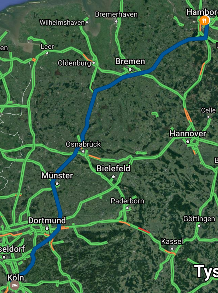 Efter 4,5 time i regnvejr på Autobahn var vi fremme i Hamborg, som er vores sidste stop på turen, inden vi vender snuden mod Amager.