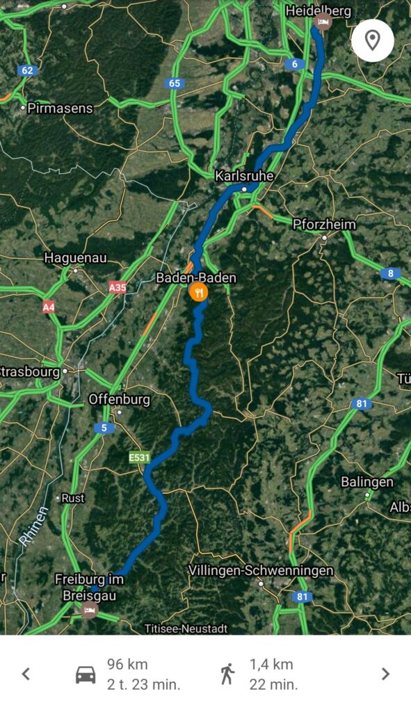 Det var blevet overskyet og de lidt tunge skyer blev hængende hele ture fra Baden-Baden og til Heidelberg, hvor vi var fremme ved 19-tiden.