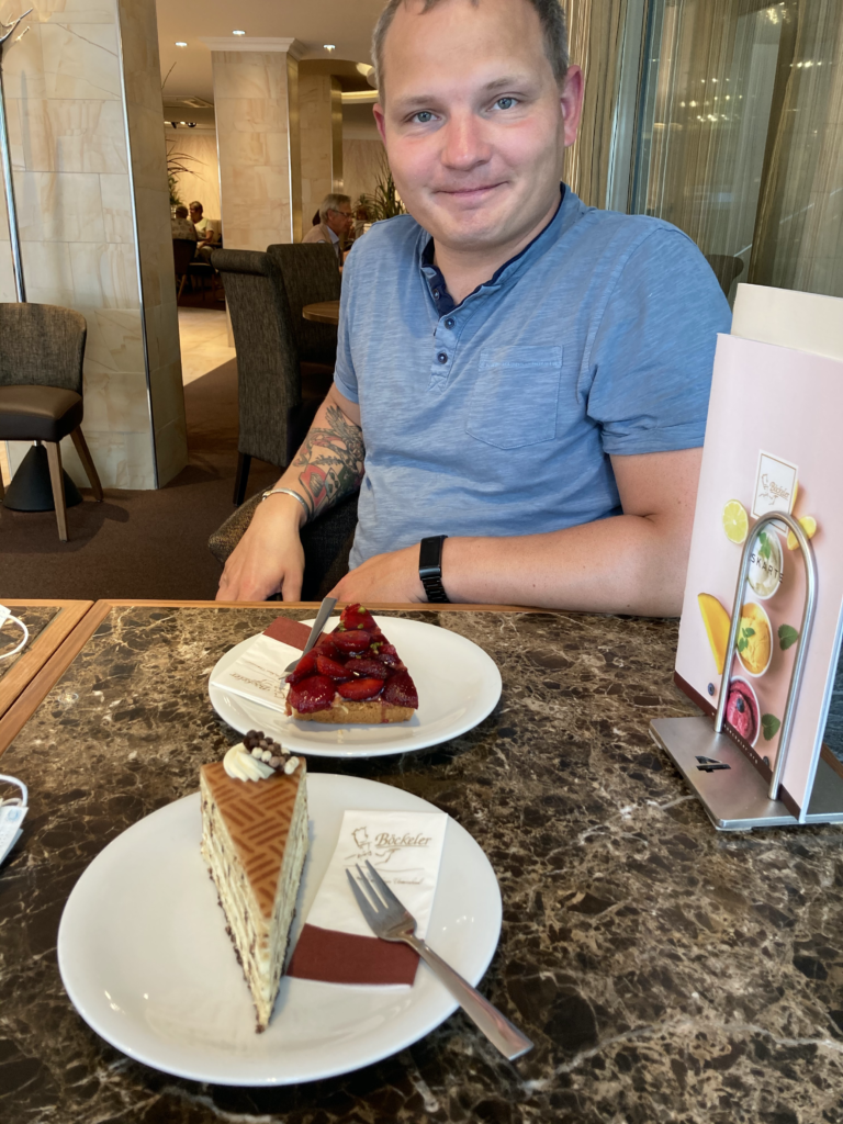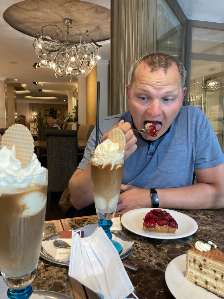 Jonas havde spottet en dessertcafé/iscafé på vej den anden vej, hvor han havde fået øje på en jordbærtærte, som maven nu kaldte på.